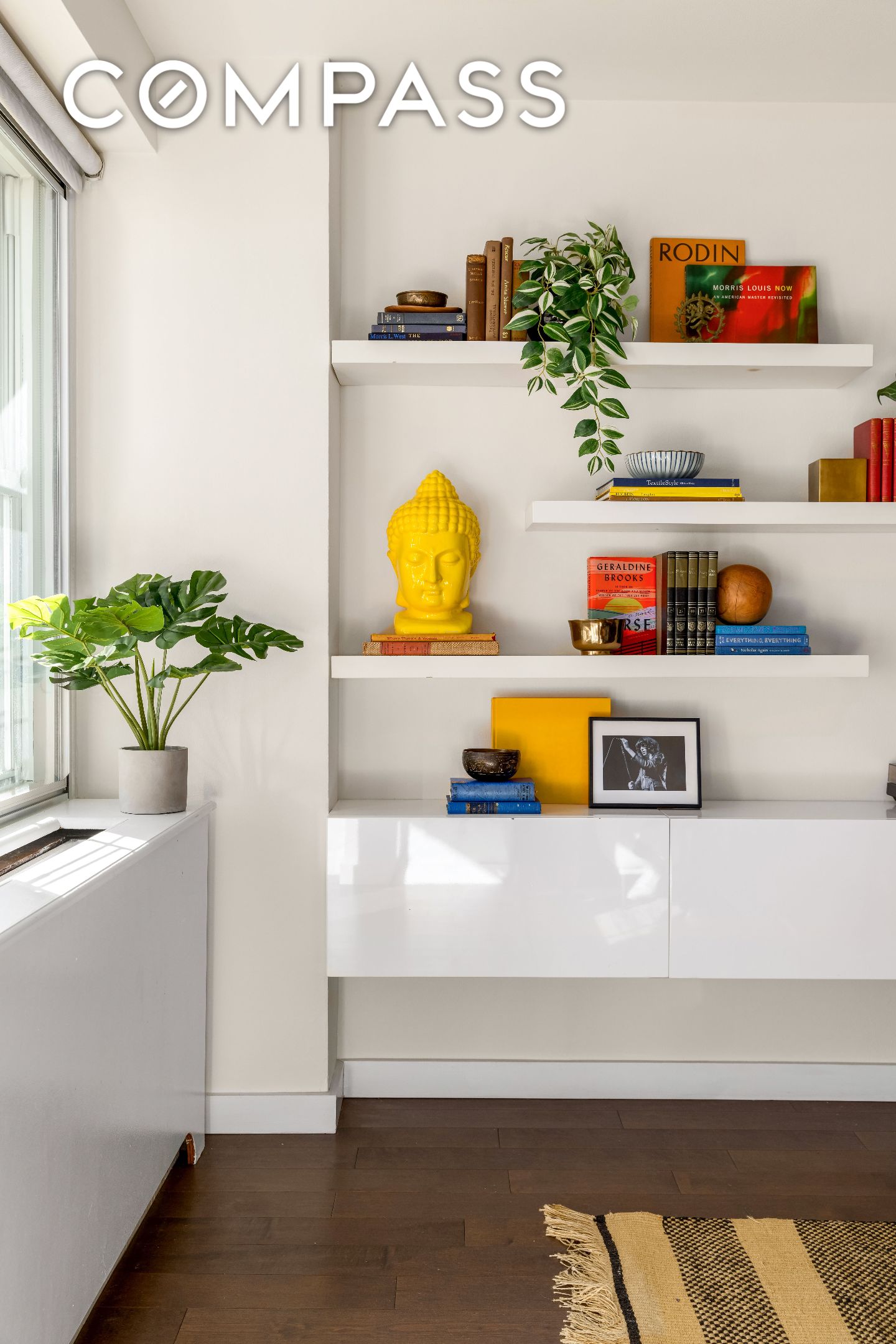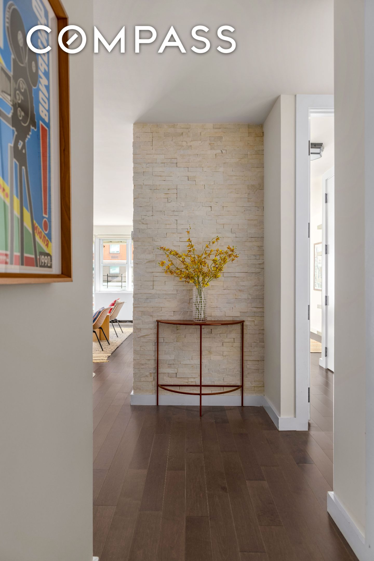 The apartment boasts oversized east-facing double-paned, soundproof windows in the living room and bedrooms which flood the spaces with natural light. Upon entering, the foyer features a custom quartz accent wall and ample closet space. Throughout the apartment there are hardwood floors, custom-made floor-to-ceiling solid core wood doors with brass hardware, high-end lighting, custom shelving, built-ins, and generous and deep closet spaces.