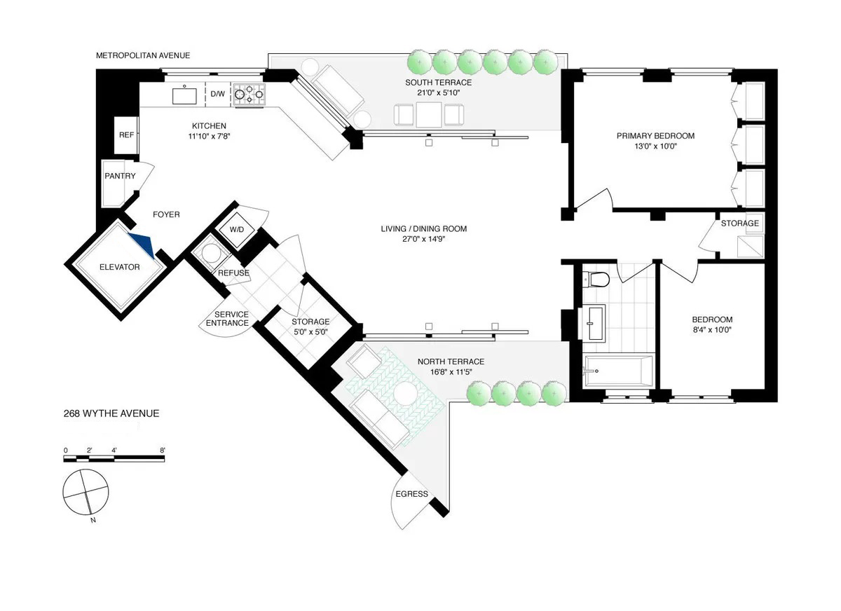 Apartment Features: - TWO LARGE PRIVATE Terraces - Central Heating and Air Conditioning - Oversized windows with triple exposure & ample natural light flowing throughout - Red Oak Hardwood Floors throughout - King sized primary bedroom - Spanish Cedar custom built closets - Separate storage room in the apartment - approx. 30sqft - Custom blinds on all windows - In-Unit Washer and Dryer - Windowed Bath - Complimentary membership for Kongo co-working space includes your own desk, file cabinet with locking key, M-F working hours access, use of conference rooms, shared spaces and all utilities. ($470 value, more info at kongo.nyc)